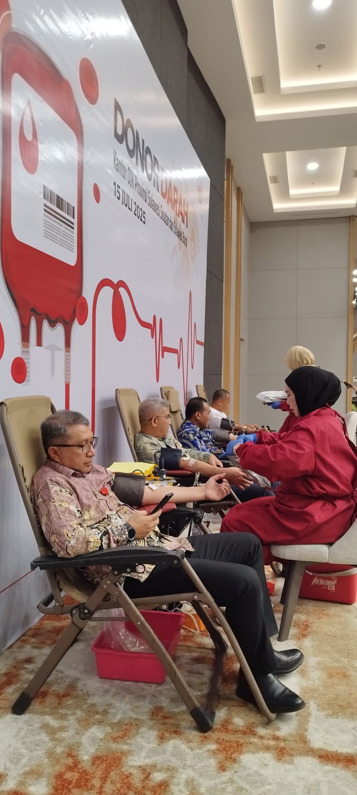 darah yang cukup menjadi faktor penting dalam menjaga keselamatan mereka.” kata Mochamad Muchlasin, Kepala OJK Provinsi Sulawesi Selatan dan Sulawesi Barat dalam sambutannya. Donor darah ini juga dihadiri oleh Kepala Dinas Kesehatan