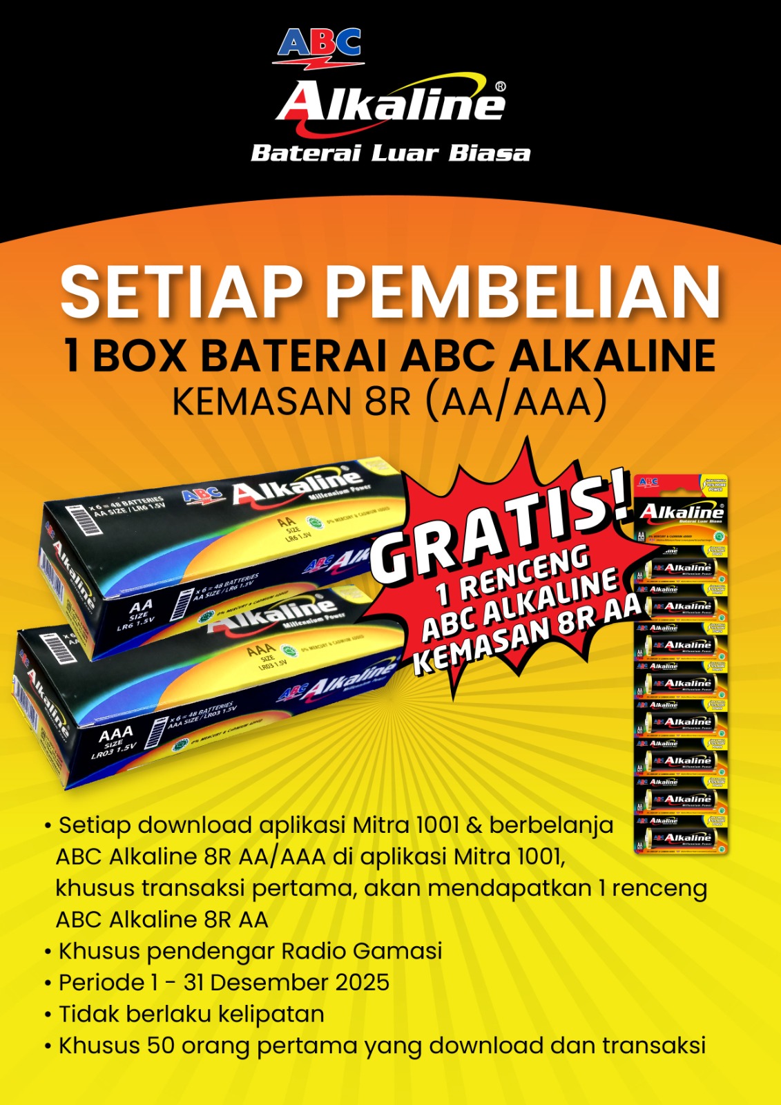 Gamasi, Makassar – Produsen baterai ABC Alkaline menghadirkan program promo khusus yang ditujukan bagi konsumen setia. Promo ini berlaku untuk 50 pemesan pertama produk ABC Alkaline kemasan 8R atau renceng melalui aplikasi Mitra 1001.